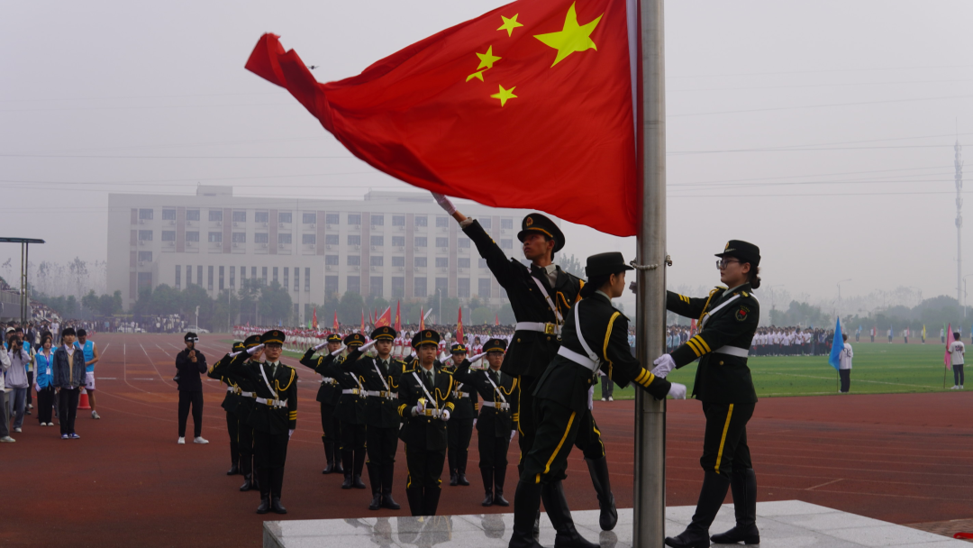 各学院入场后所有人起立,国旗护卫队迈着整齐铿锵的步伐,抛起鲜艳的五星红旗,拉开了运动会的帷幕,赛事在各个代表的发言后正式开始!