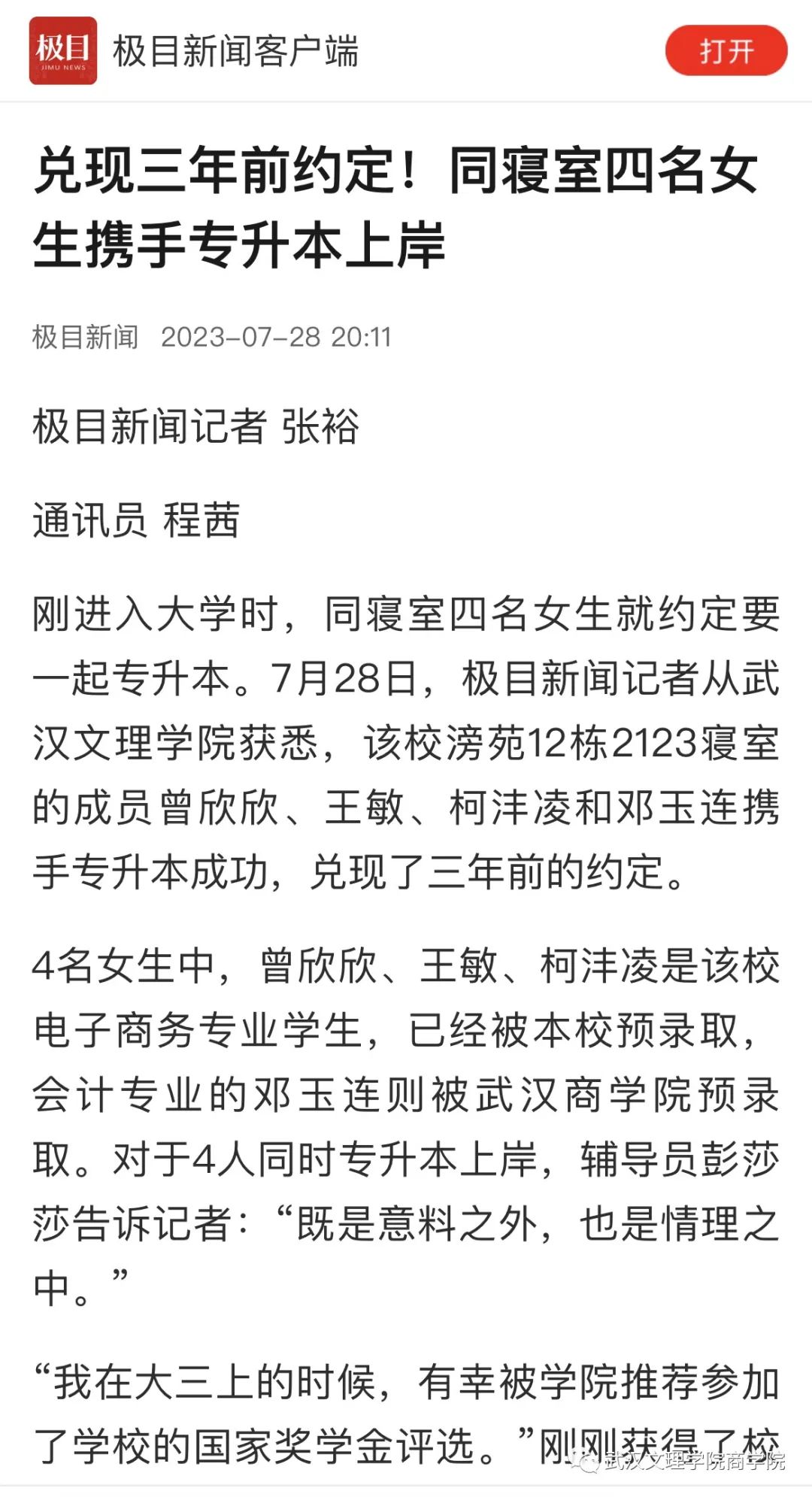 7月28日,极目新闻报道beat365中国官方网站同寝室曾欣欣、王敏、柯沣凌和邓玉连四名学生携手考取专升本的事迹。