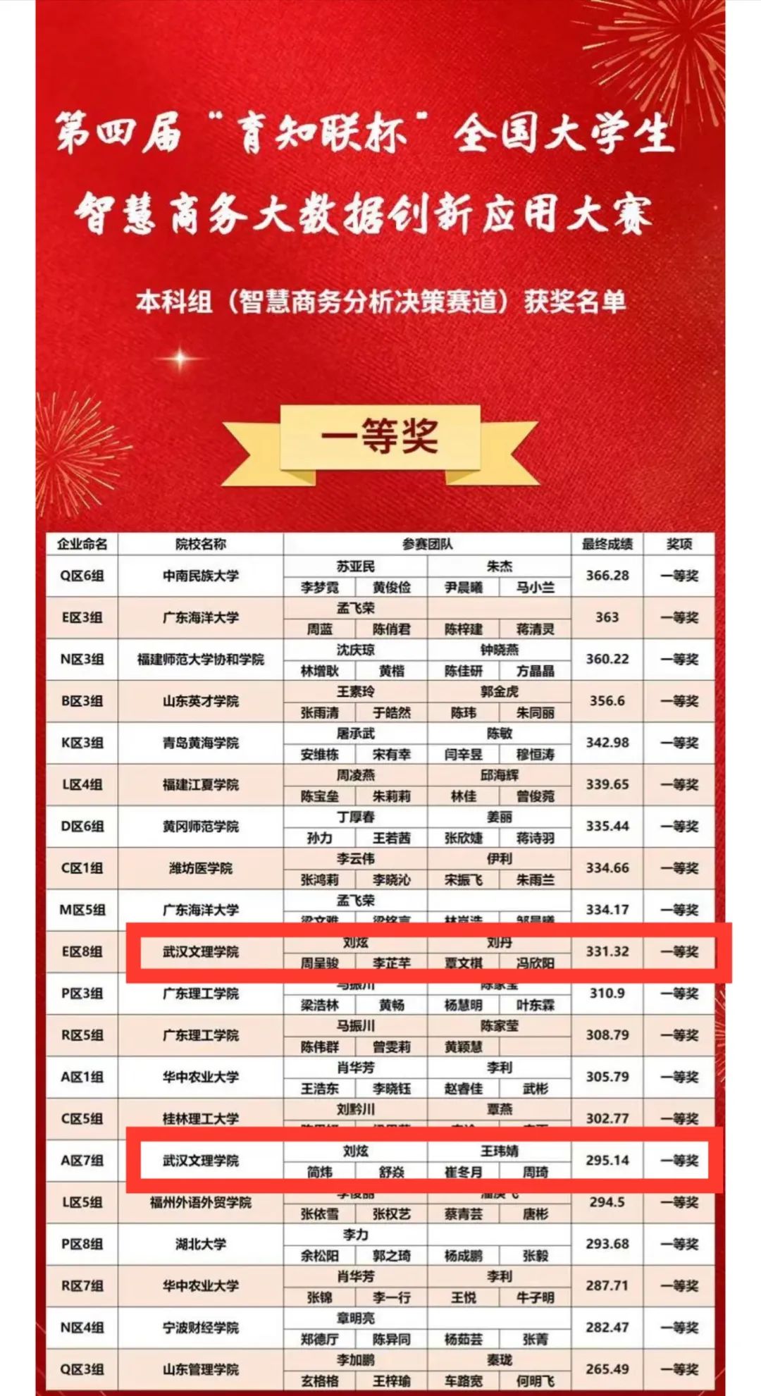 4月,2023年第四届“育知联杯”全国智慧商业大数据创新应用大赛暨亚洲beat365中国官方网站数智精英挑战赛传来喜讯,beat365中国官方网站刘炫、刘丹、王玮婧老师指导的周呈骏、李芷芊、覃文琪、冯欣阳、简炜、舒炎、崔冬月、周琦分别组成的两个学生团队均荣获本科组(智慧商务分析决策赛道)一等奖。