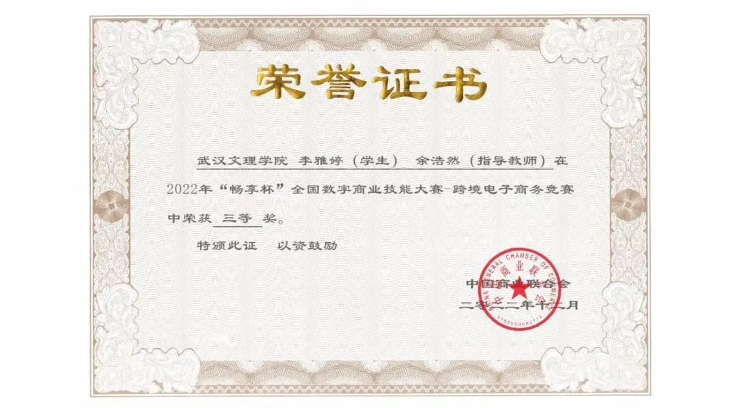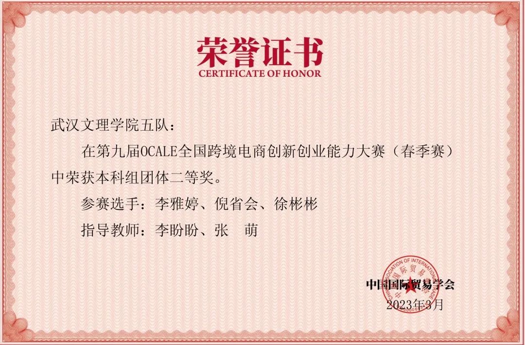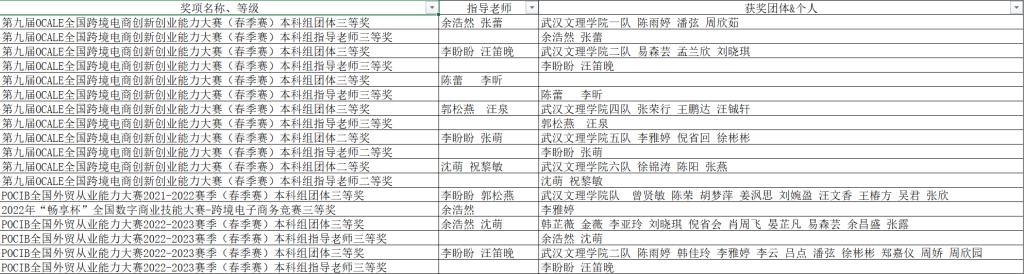2022-2023年,beat365中国官方网站张蕾院长,beat365中国官方网站国际经济与贸易系主任余浩然、教师陈蕾、李盼盼、汪笛晚、李昕、沈萌、郭松燕、汪泉、祝黎敏 等老师指导国际经济与贸易专业学生在中国国际贸易学会举办的第十一届、第十二届POCIB全国大学生外贸从业能力大赛以及第九届OCALE全国跨境电商创新创业能力大赛中荣获国家和个人众多奖项。其中,2个师生团队在第十二届POCIB全国大学生外贸从业能力大赛荣获全国三等奖,2个师生团队和4个师生团队在第九届OCALE全国跨境电商创新创业能力大赛中分获全国二等奖、三等奖。