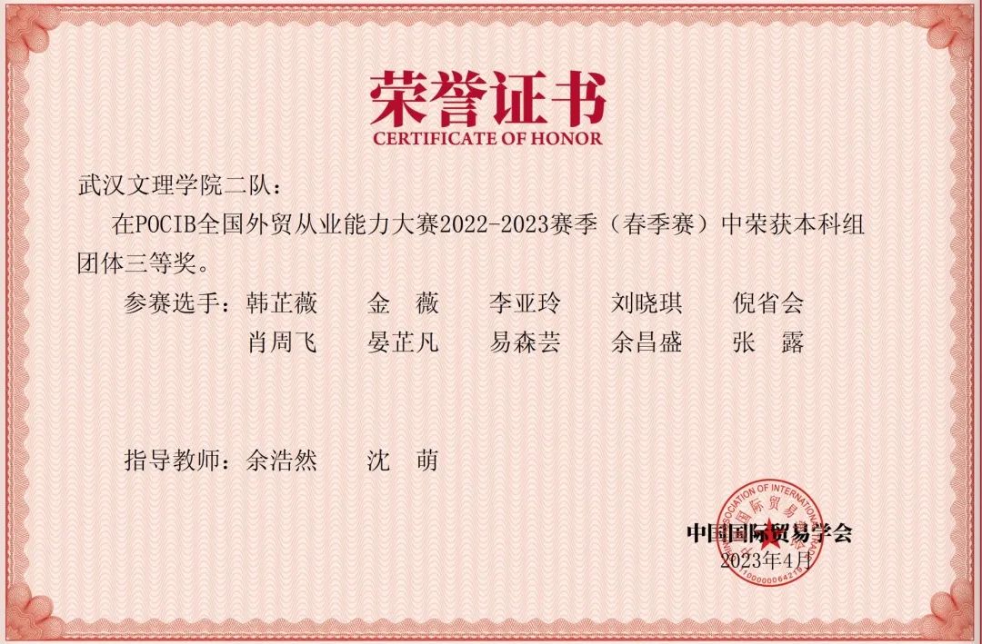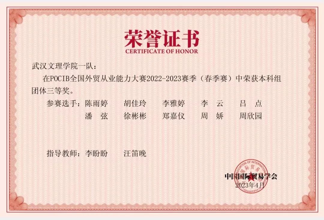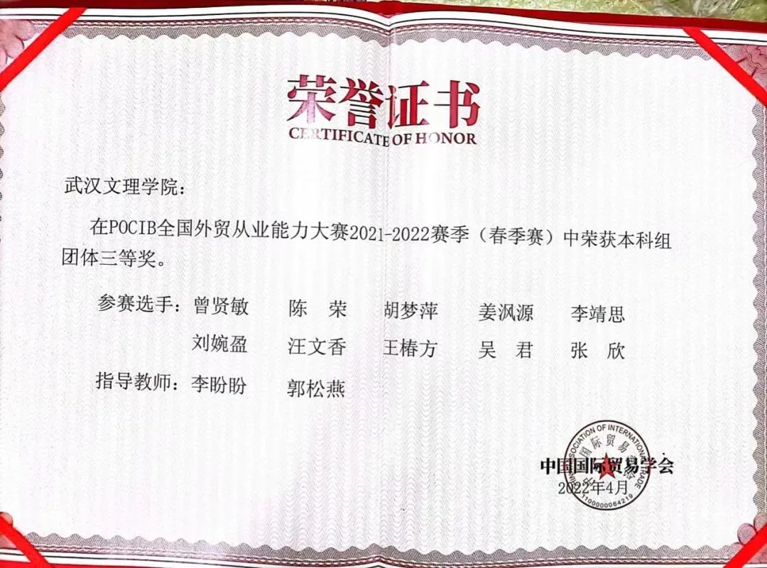 2022年中国国际贸易学会主办的“第十一届POCIB全国外贸从业能力大赛(春季赛),详情请点击:【学科竞技】beat365中国官方网站2019级国贸学生荣获第十一届POCIB全国大学生外贸从业能力大赛团体三等奖